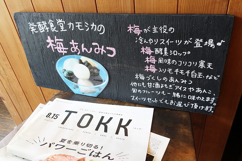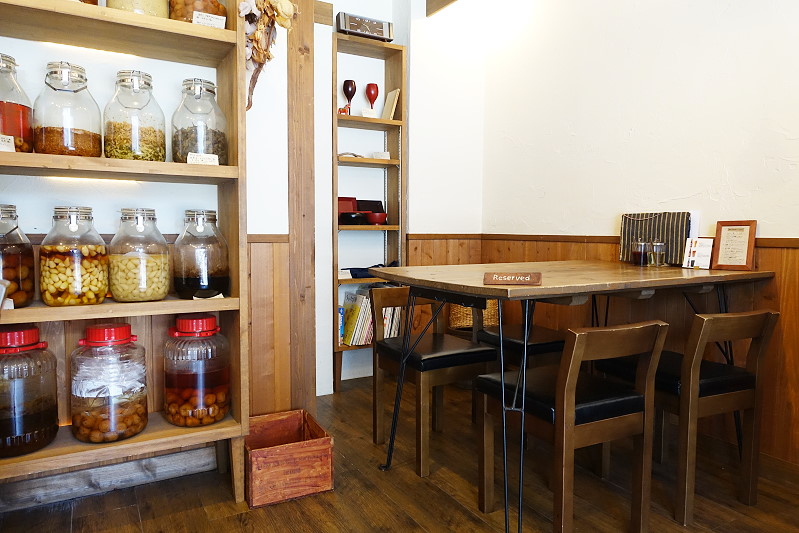 從雜誌看到發酵食堂的介紹,去京都嵐山吃廣川鰻魚飯時就順便到發酵食堂喝杯飲料、吃個點心,才滿足的離開嵐山。發酵食堂離JR嵯峨嵐山駅較近,從北口走約3-5分鐘可達,以各式發酵餐食飲料為主,店內位子不多,約有2張桌位與4個吧台座位,那日午後進來的客人很有默契,一有空位就有客人剛好進來,也不必候位,真是太幸運了。