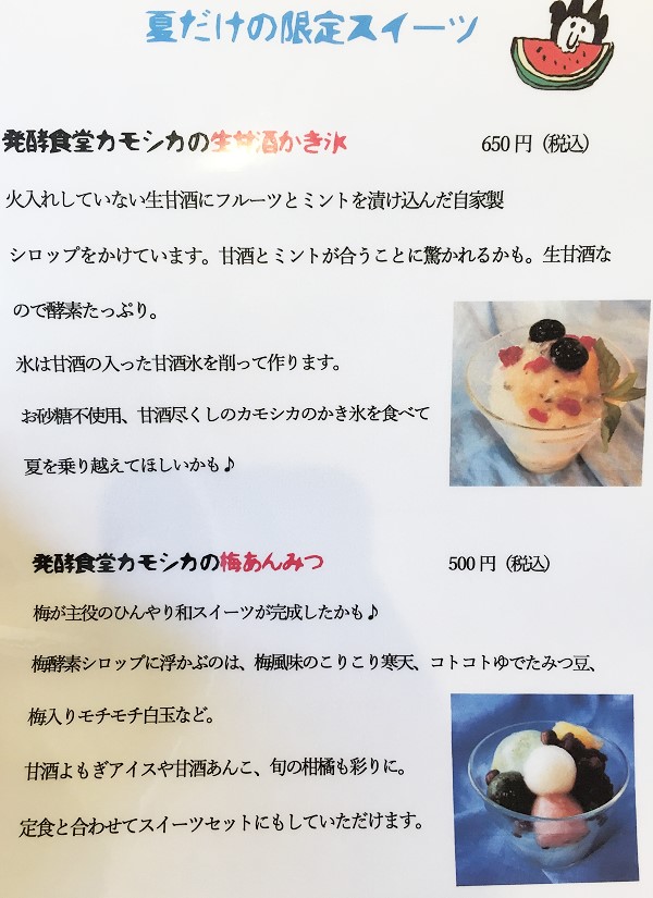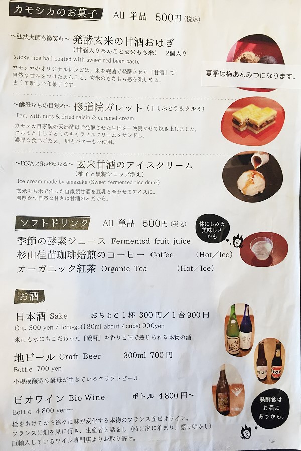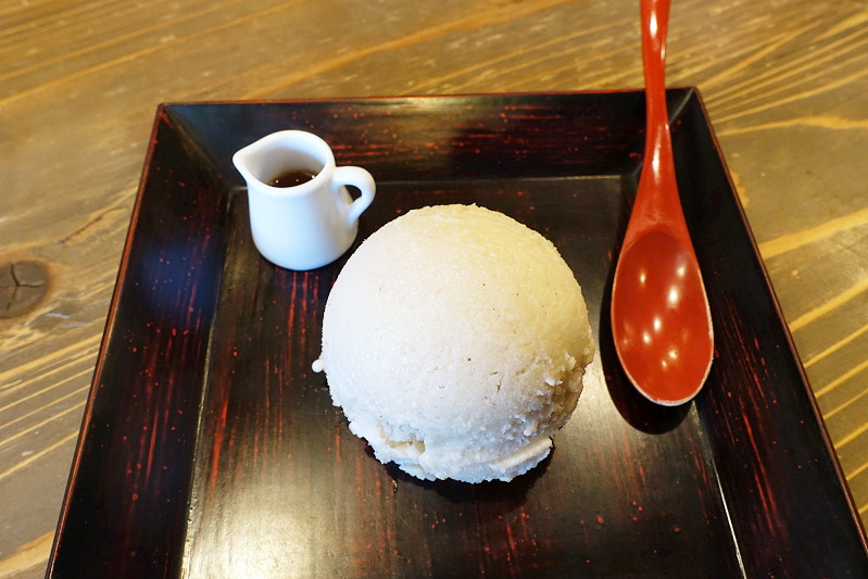 我們進去時只剩吧台座位,吧台周遭放置一罐罐的發酵食材,有8種發酵定食可選,也可像我們一樣喝飲料吃點心,飲料與點心的價格均一為500円,我點了季節的酵素果汁與修道院點心,酵素果汁可選梅子或檸檬,選了梅子果汁,在炎炎夏日喝起來相當清爽,梅子大顆美味,以天然酵母製成的修道院堅果點心,吃起來外酥內甜,多層次的口感搭配茶或果汁都好。室友點的是有機紅茶與玄米甘酒冰淇淋,不加糖的紅茶喝起來有自然甜感,冰淇淋的滋味像是醬油冰淇淋,滋味獨特~:))