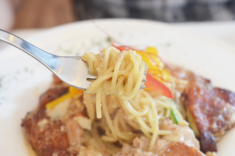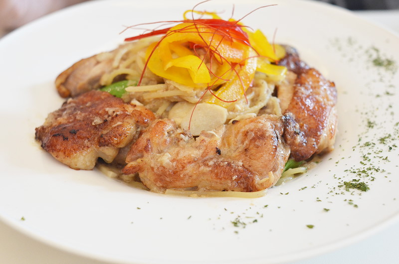蒜辣白酒雞腿排義大利麵,209元。