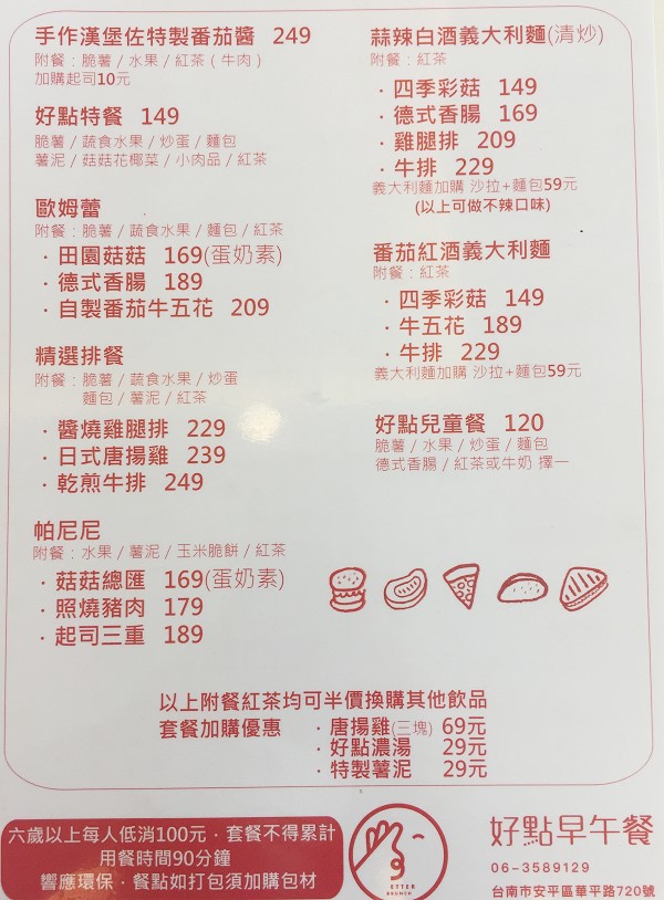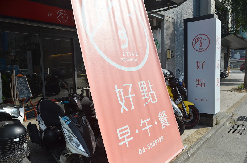 這日下午想去鹿柴咖啡,中午想順道在安平吃午餐,查了一下網路資料,在華平路與安平路交叉口附近有家2018年5月份開的早午餐,名為好點 Better Brunch,在椿之味薏仁湯斜對面,紅底白字的招牌和布條為其招牌主色,店前面雖然沒有停車格,但詢問店員,她很親切的指引附近停車處,雖然要走一小段路,但能順利且不違規的停車真是太好了。