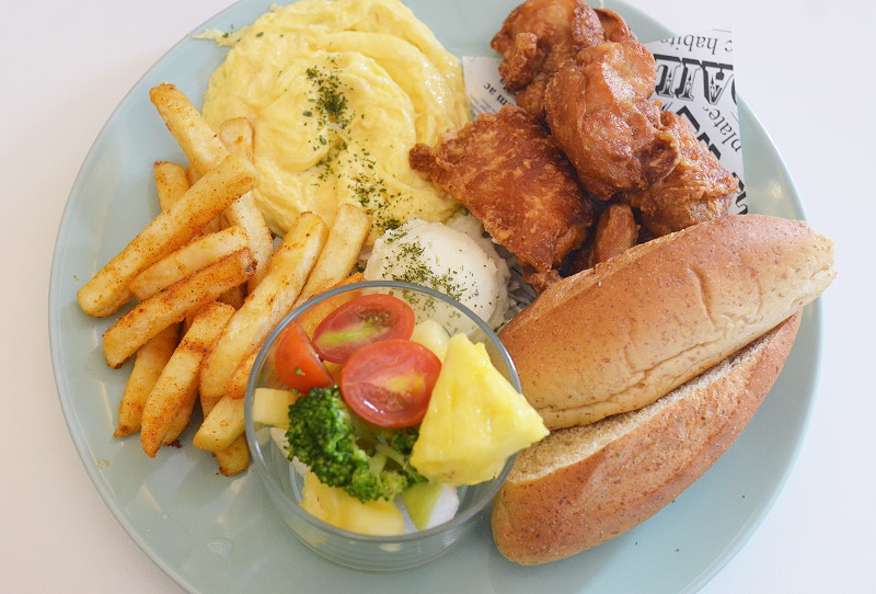 除了早午餐外,好點也提供義大利麵的選擇,這日便點了一份日式唐揚雞早午餐與蒜辣白酒雞腿排義大利麵,室友點的蒜辣白酒雞腿排義大利麵,名稱雖有蒜辣,但可做成不辣,蒜香味較重。雞腿排的份量也好足,早午餐附日式唐揚雞、脆薯、蔬食水果沙拉、炒蛋、麵包、薯泥和紅茶,份量不少,日式唐揚雞有6塊,雖慢吃久放似乎有點油,但外酥內嫩的炸雞腿肉,份量多且鹹度剛好,其他的配菜附食也都合味,當午餐吃也很有飽足感。