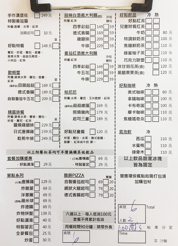 出發前才訂位的我們幸運還有空桌可坐,中午沒訂位就得碰運氣了,這裡是親子友善餐廳,看到不少家庭帶著小小孩到餐廳用餐,菜單上會把早午餐的內容註明清楚,雖然都附脆薯,不喜歡炸物的客人也可以把炸薯條換成菜,我們雖沒有換成菜,但餐點附蔬食水果。少吃生菜的我們詢問能否不要生菜,店員說可以換成全部都是水果,不會麻煩,能半客製化的服務真讓人倍感貼心。