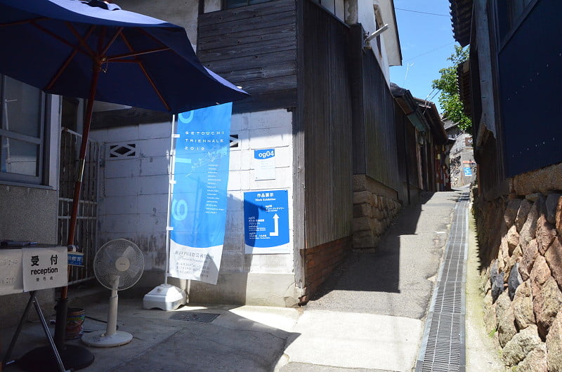 在彎彎曲曲的坡道中行走。原本的男木島郵便局搬到港邊後,變成了藝術祭的展示空間。