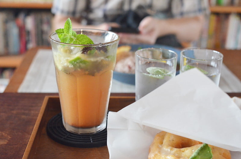 先在室外櫃台點餐結帳,可在冷氣開放的圖書館內用餐。這日提供鯛魚咖哩,加上彩椒、茄子等蔬菜一起燉煮上桌,喜歡咖哩的香料味,也喜歡略煎過的鯛魚風味。另外還點了有柚子與檸檬草香的甜甜圈,表面糖霜稍硬,口感厚實,還點了杯香草可樂一起搭食,這裡的香草均為自家種植,滿足的吃喝完,再悠閒的在書架上找一本自己有興趣的書,若不是趕其他作品的參觀時間,還真想多停留一些時間~:))