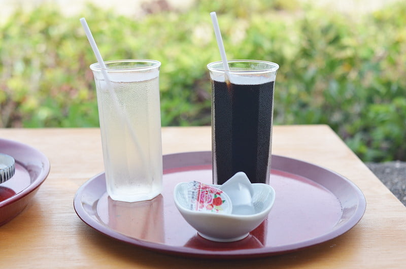 左邊是青紫蘇汁,400円;右邊是咖啡,400円。