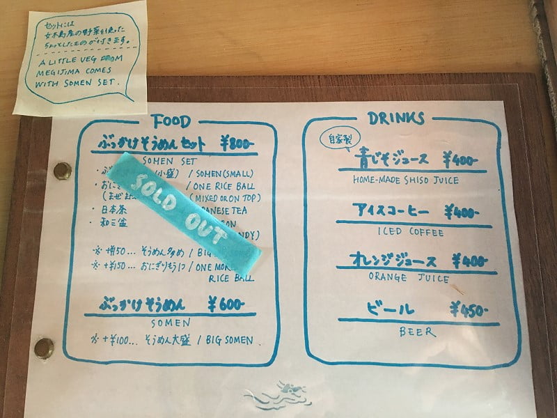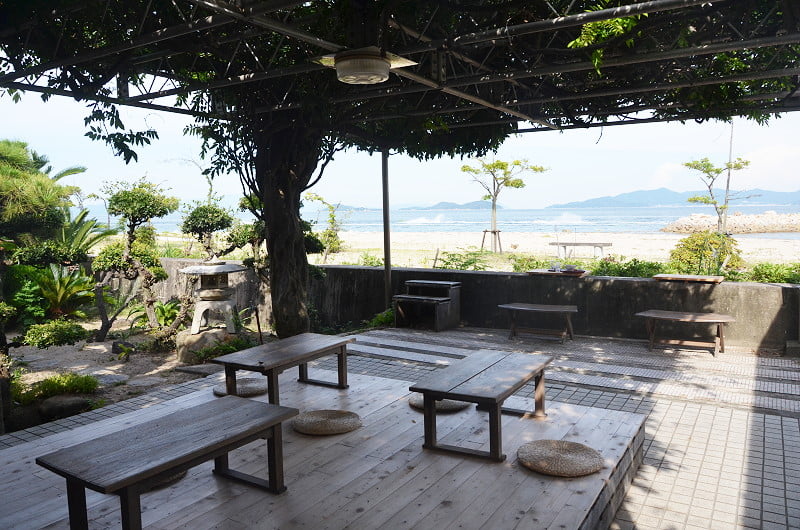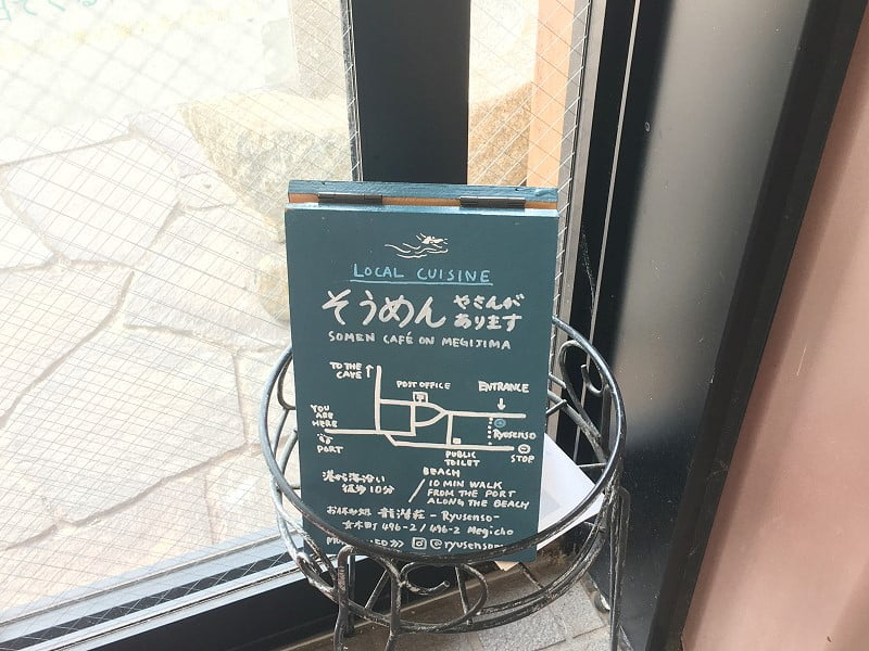 這日宿在女木島,行前在雜誌看到女木島新開的龍潛莊(龍潜荘),提供素麵和飲料等餐食,環境與餐食照片看起來都讓人喜歡,決定來到女木島時一定要到這裡吃碗素麵。從高松港到女木島只需20分鐘,下船後可看到龍潛莊的小招牌,沿著日間人聲鼎沸的海岸前行,也可看到龍潛莊的小招牌。