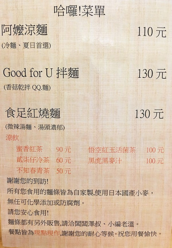 推門走進店裡,店內的座位並不多,有一長桌約可坐5-6人、吧台前的桌位約可坐4位,用餐時間來,座位已剩不多,還好店家協助併桌,讓我們可順利坐下來點餐。目前餐點提供三種:涼麵、香菇乾拌QQ麵、紅燒湯麵,均為套餐內容,價格落於110元至130元間,有麵類主食、一道青菜、一碟沙拉、一杯無糖但好香的桂花茶。乾拌麵還會附一碗味噌湯,份量看似不多,還開玩笑說待會兒要順路去健康路吃不健康消夜,但吃完後很有飽足感,連回家喝杯燕麥都覺得撐。