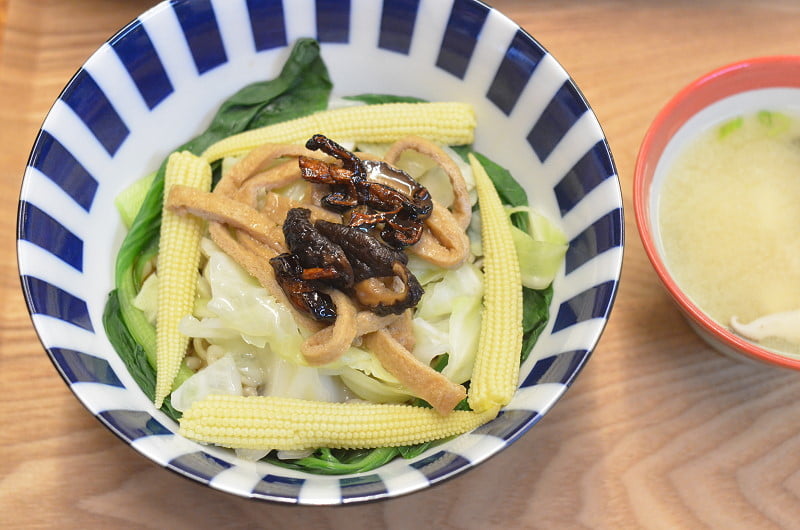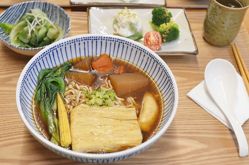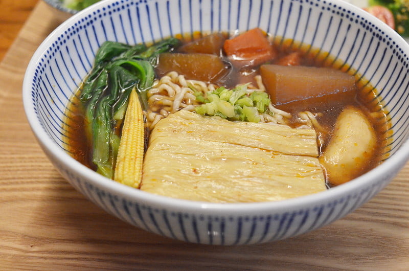 自己點的是紅燒湯麵,有青菜、玉米筍、杏鮑菇、紅白蘿蔔、一大塊豆皮,青菜的份量很足,微微辣的湯頭很開胃,加上用日本麵粉製作的札幌拉麵口感很有彈性並帶些嚼勁, 在涼意漸襲的傍晚喝點湯、吃些麵,很暖身。室友點的是香菇乾拌QQ麵,麵條上方一樣鋪上滿滿的青菜,有青江菜、高麗菜、玉米筍、豆皮切絲,也是用札幌拉麵烹煮而成,原本室友不看好乾拌麵的滋味,吃了幾口後就忍不住迅速吃完。