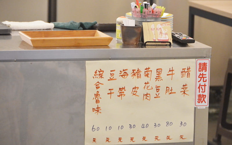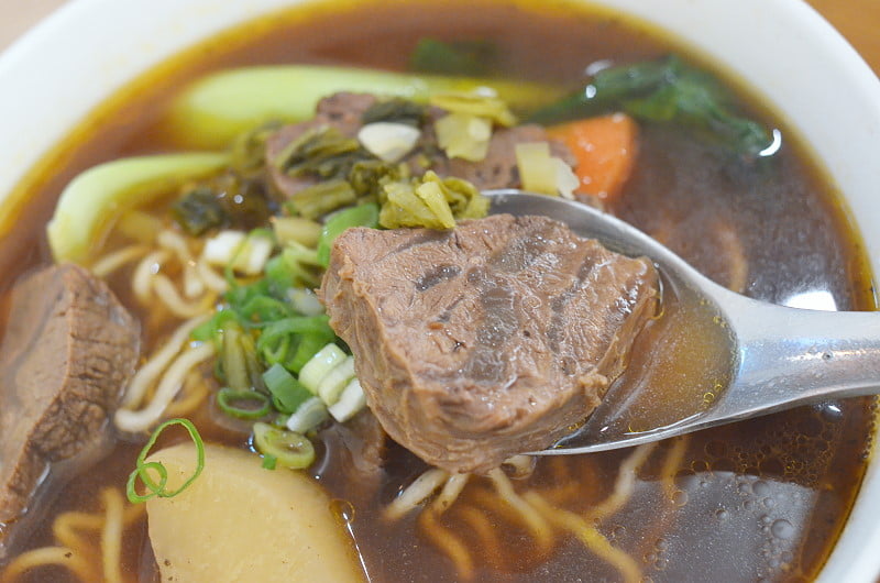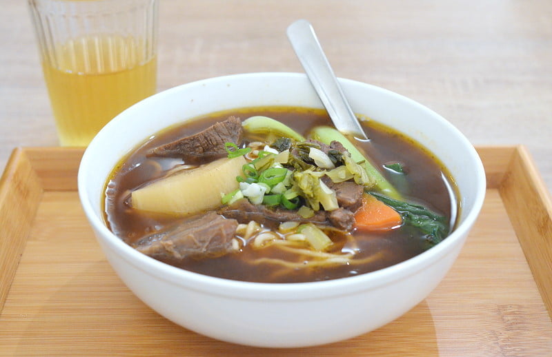 南門牛肉麵的廚房在外面,推門走入,緊閉門窗、冷氣開放的室內座位區相當整潔乾淨,價格與一般麵店無異。客氣親切的老闆送上菜單與二杯烏龍茶,餐點選擇以牛肉麵食、炸醬麵、爌肉飯、水餃等為主,也有各式滷味可搭配。室友點的是南門牛肉麵,送上桌時是用木盤盛裝麵食,相當有質感,湯頭清甜,碗內有紅白蘿蔔、青菜和牛肉,整體味道相當合味,食量大的人建議加麵會較有飽足感。