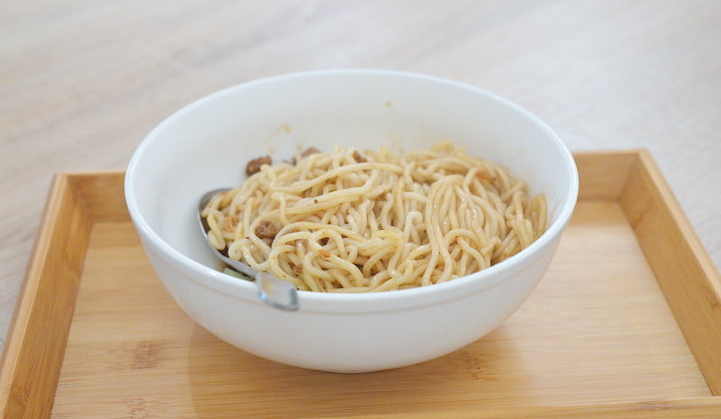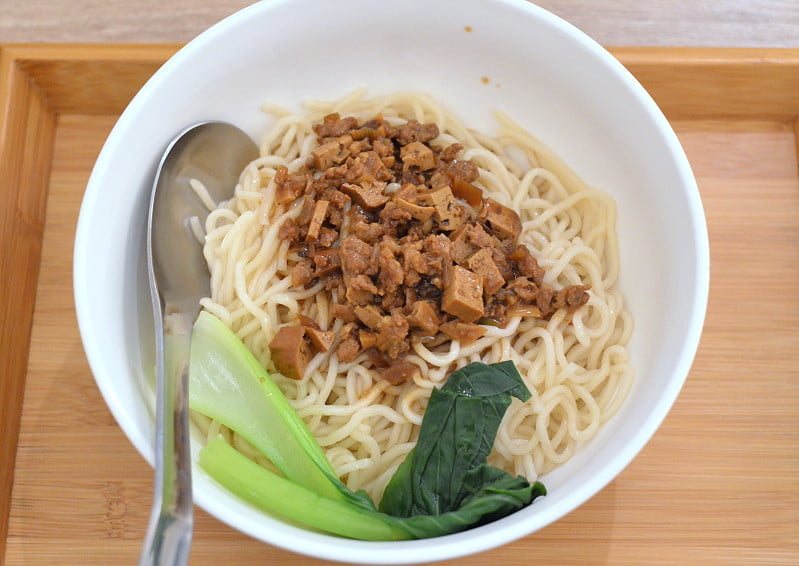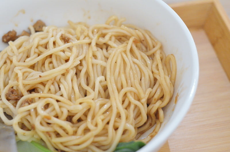 不吃牛肉的人也有非牛料理可選,自己點的是炸醬麵,使用新鮮溫體黑豬後腿肉製成的炸醬,多是瘦肉,是自己偏愛的肉質部位,加上切成丁狀的豆干、醬汁,炸醬配料簡單夠味,向來熱愛牛肉麵的室友也忍不住嚷著下回來也要點炸醬麵。一端上桌,老闆提醒要趕快把麵拌一拌哦!熱呼呼的炸醬搭配有彈性的乾麵,相當滿足。