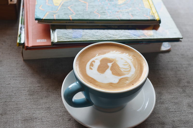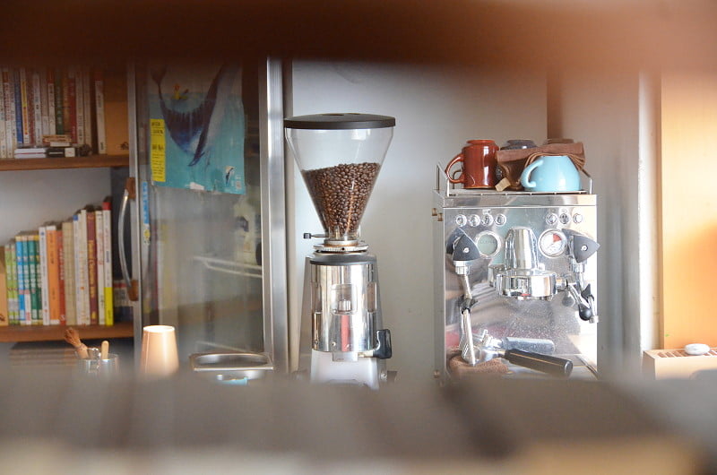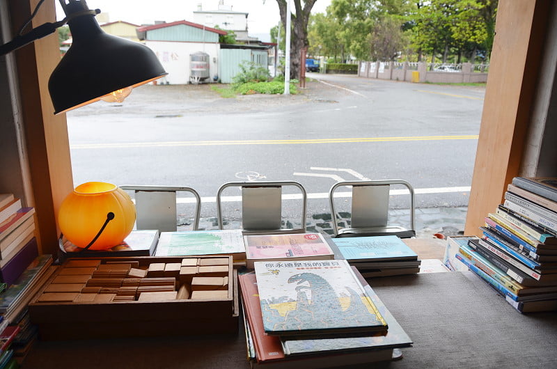 練習曲店裡的書是非賣品,僅提供借閱,想借書的人自行在本子上登記,若想坐下來喝杯飲料,也有咖啡、小油菊花茶和洛神花茶可選,跟胡老師點了一杯熱拿鐵和小油菊花茶後,熱拿鐵風味出乎意料的順口溫潤,甚至覺得比起途中一些專業咖啡店還好喝。坐在靠窗的吧台座位,遠望天主教會的鳥居和新城寧靜街巷,或是拿起靠窗的繪本小說,也是愜意。