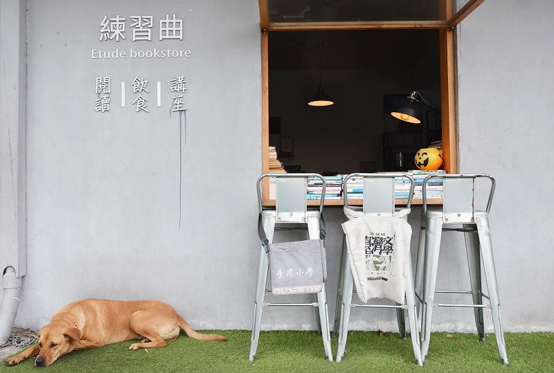 來到花蓮,吃完早餐便驅車前往新城的練習曲書店,這是新城國小棒球隊教練胡老師所開的書店,為了讓棒球隊小朋友能有個閱讀的地方。書店位於新城天主教會斜對面,停車相當方便,胡老師將老房舍整理的相當明亮乾淨,外開的木窗、靠窗的吧台椅、灰色調牆面、「當個文青來看本書吧!」等外觀元素,加上不時在書店周遭行走的幾隻狗兒,忍不住停駐多拍了幾張照片,更想走進書店好好看書。