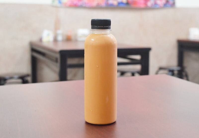 隔一個星期,想念潘妮的打抛豬飯時又去了一次,室友照例點了愛食-打抛豬飯,我則點限量提供的大碗泰式雞腿肉飯,附清湯,雞腿肉剪撕成小條狀,沾上些許醬料的鹹味更下飯,飯則是用泰國香米,覺得大碗份量剛好,若是點小碗可能會吃不飽,附清湯,適合不想吃過於油膩的夏日選擇。近日推出泰國奶茶,一瓶40元,喝不完方便帶走,不用吸管也好飲用,不太甜的風味很合味,二人各點一道主食、合飲一瓶泰奶,就有飽足感了,不到200元的價格真是實惠。