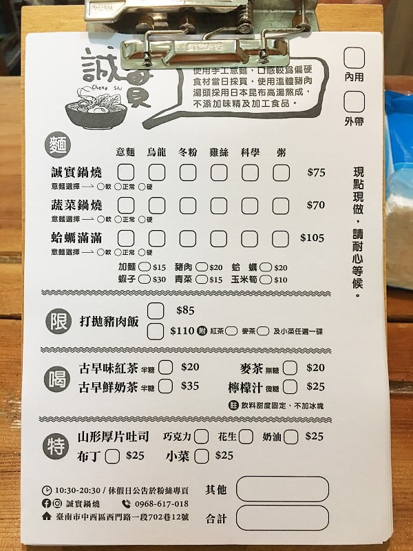 店長當時告訴我們,接下來將搬遷至西門路而且是店面有冷氣。選了一個肚子不太餓的晚餐時間來吃誠實鍋燒2.0。搬家後的誠實鍋燒,菜單與之前的品項不太一樣,選擇多了不少,原先的金箔鍋燒已不在菜單中,改為蛤蠣滿滿鍋燒,還有厚片吐司、布丁、飲料等餐點可供加購。這日各點一碗鍋燒意麵、布丁和鮮奶茶合食,誠實鍋燒的湯頭清爽甘甜,沒有多餘的加工食品,蝦、蛋、蛤蜊、肉、蔬菜等是主要食材,雖然不見得能吃得很飽,但一定能吃的很健康。