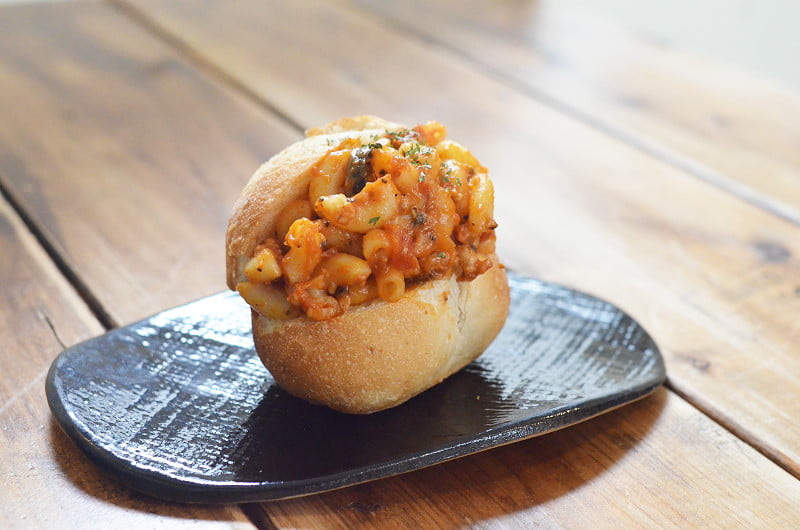 共點了四個餐包,一甜三鹹,先送上的是海鹽餐包,盛裝容器相當可愛,像是主角般登上桌面,閱讀隨餐包附上的食用須知,決定速速拍完立即享用,能嚐到冰淇淋般的奶油口感,海鹽風味不膩而清爽;店員推薦的奶油熱餐包組也很討人喜歡,一組100元,能吃到松露奶油與明太子奶油,熱餐包酥香,二種各自精采、帶鹹的風味很適合中午享用;茄汁肉醬通心麵則是室友的選擇,半剖的餐包夾上茄汁通心麵,醬汁微辣,不嗜辣的室友的評價還好。