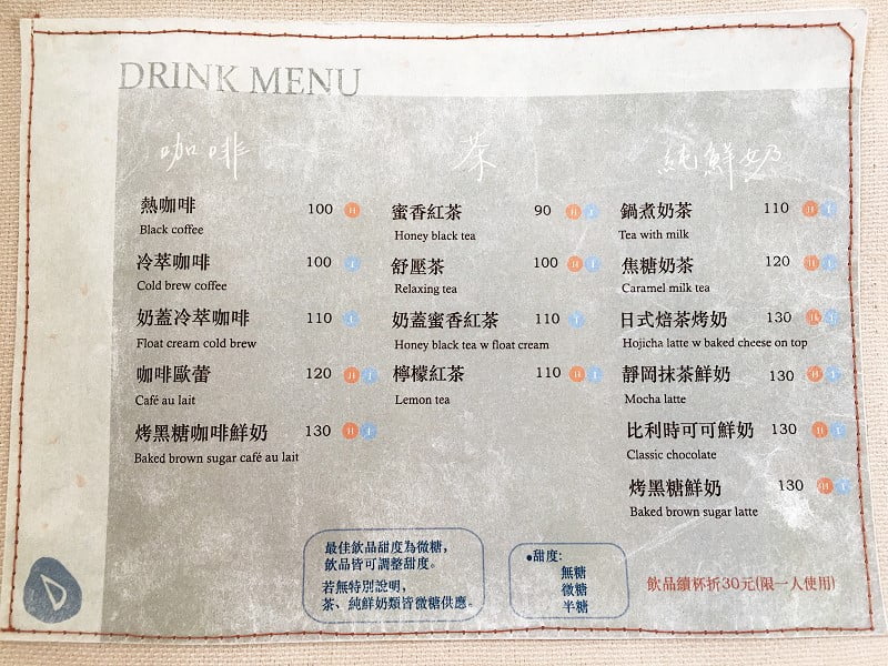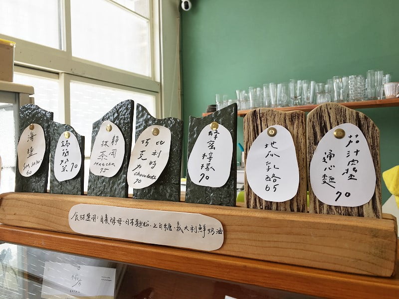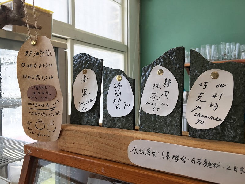 很喜歡頓號的建物立面,有曲線,乾淨簡潔的線條很討人喜歡(請忽略二樓)。開店沒多久後,店內座位全滿,很慶幸自己早點到。座位在一樓,有二人、三人、4-6人桌。一張桌子只坐一組人,即便客滿時店家也不會請客人併桌。入座後店員先送上飲料菜單,餐包種類則至櫃台選擇,先結帳後出餐。