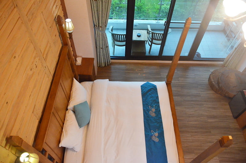 原本訂的是B5登機門,以清邁禪風為設計風格,很喜歡鄰近檳榔樹的百葉窗樹影風景,白天傍晚各有不同光影,辦理入住手續時幫我們做升等,可以入住B5,也可選擇B3登機門的歐風柚木樓中樓房型,最後還是選擇較寬敞的B3,像是歐式木屋房型,陽台可遠眺周遭絲瓜日間開花景觀,樓中樓可享有個人空間,但我們還是在一樓活動,床夠大又好睡,來回奔波得到一夜好眠,真是感謝~^^