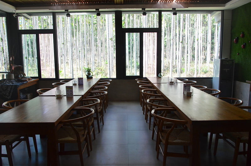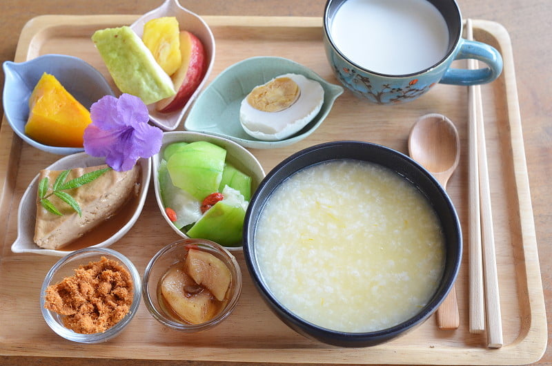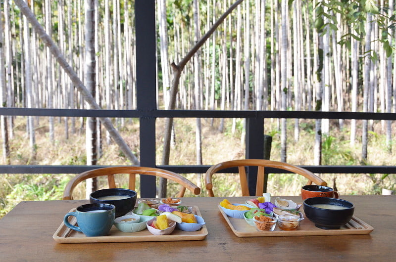 早餐可選擇室內座位或是半戶外空間,我們喜歡檳榔樹的陳列壯闊,選擇半戶外空間,民宿小幫手會詢問需要何種飲料,上菜時也會說明食材來源,選用在地食材,喜歡還可以到民宿的幸福小鋪買回家,以粥品為主,搭配絲瓜、南瓜、滷豆腐、肉鬆、鹹蛋、水果等食材,有飽足感卻又不覺得身體負擔大。
