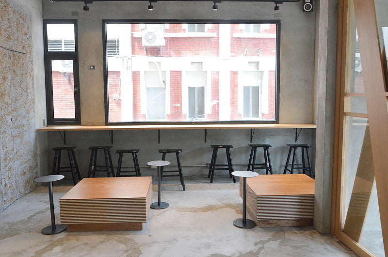 入內會先拿到MENU,自己找喜歡的位子坐,決定好餐點後就到一樓吧台點餐結帳,可報電話成會員以累積消費,即便人多,店員們的態度還是很親切。選擇拿鐵與單品 -衣索比亞日曬谷吉,還有一塊巴斯克乳酪蛋糕,一樓的靠窗座位是紅白建築景,忽略街上一些細節的話,自已也滿喜歡的,還有咖啡銀皮裝飾的牆面,一開始以為是刻意保留舊建築的鏽蝕痕跡,仔細一瞧,這才發現原來是咖啡銀皮,店家也將銀皮做成杯墊,很耐看~:))