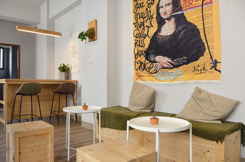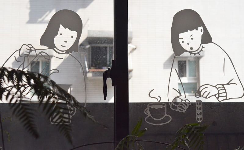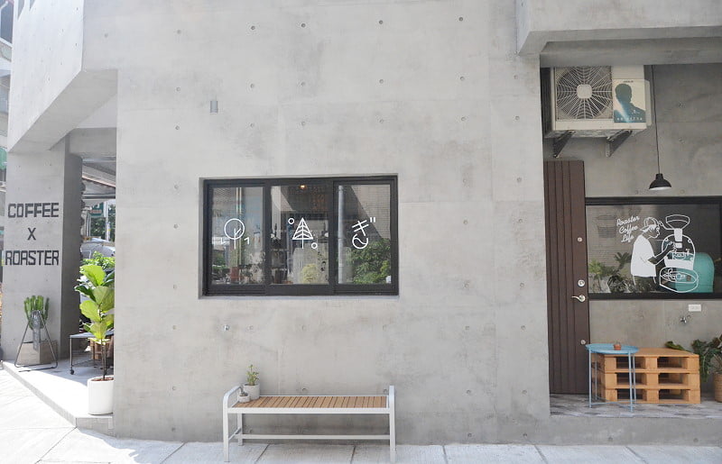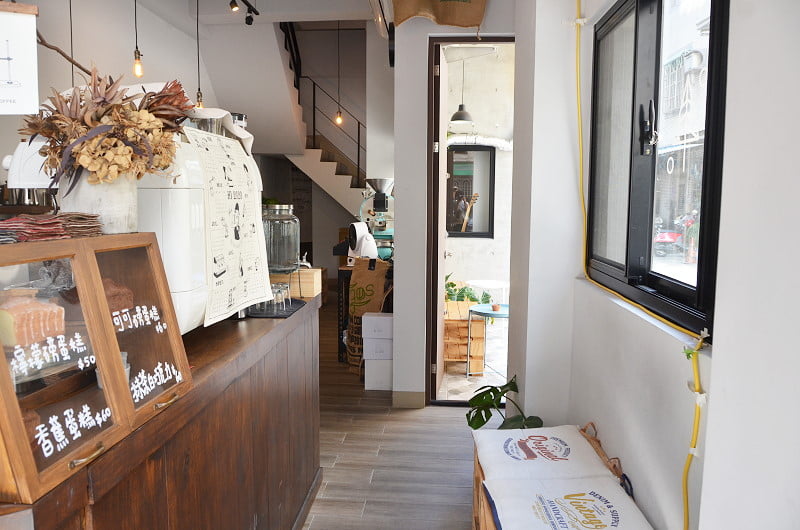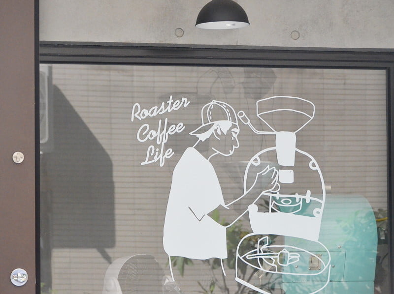 烘豆機在室內,窗戶有烘豆插畫,還有座椅區,喜歡這樣的設計。若不是空污,還真想坐在戶外呀。