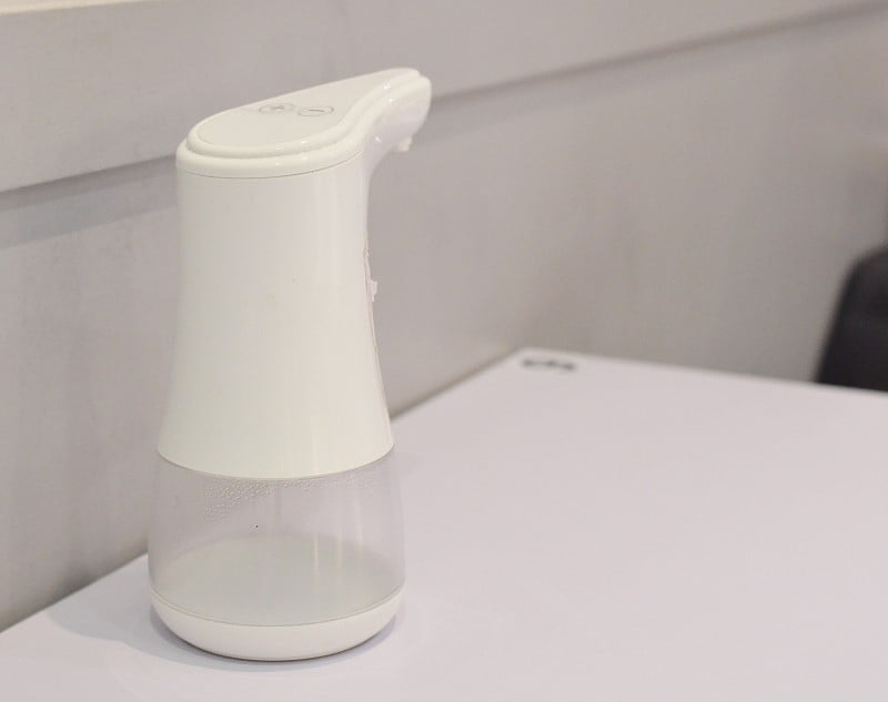 每張桌上都有一罐自動酒精消毒器。