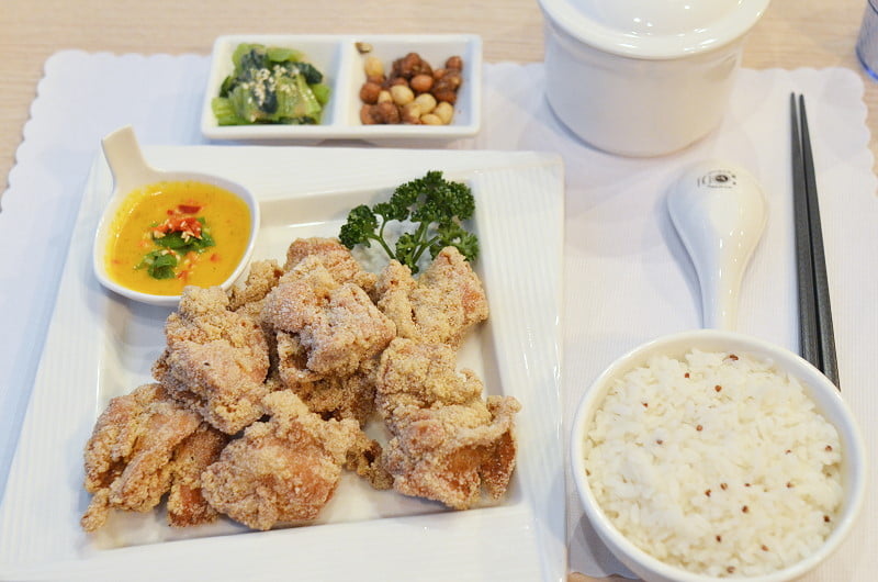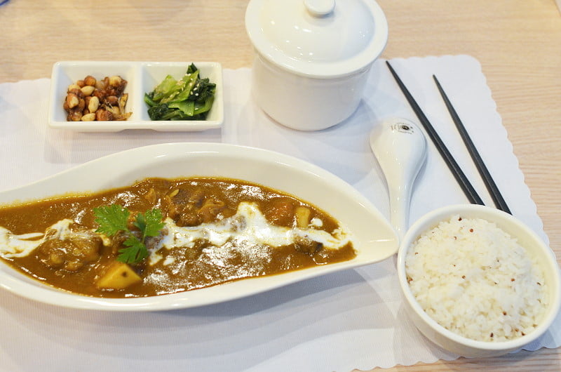 準時進去,幫我們安排在靠窗的四人桌,真是太幸運了,早在FB上看好想選的菜色,進去就能立刻點餐,這日點的是泰式椒麻雞腿飯與咖哩牛腩飯,主食套餐價格落於270元-290元間,含主食、飯、二道小菜、湯和飲料,份量、價格與味道都讓人覺得實惠。