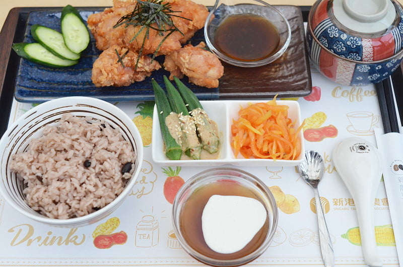 嘉義新港的新農豆食堂是新港農會的舊穀倉,是1965年的建物,迄今也有56年的歷史。這裡保留穀倉原有的檜木屋頂,空間引入大量自然光,木作裝潢增加暖度,有用餐區亦有農會農產販售區,吃完還可帶些農產伴手禮回家給親友,買到非常鮮甜的有機牛蕃茄和有機馬鈴薯,家人非常買單。最棒的是,這裡有寬闊的停車場,用餐不必擔心停車問題,對我們來說實在是大大加分,結完帳就可拿到停車代幣,相較於原本打算去的民雄,停車不易,新港實在是停車友善的好地方~:))