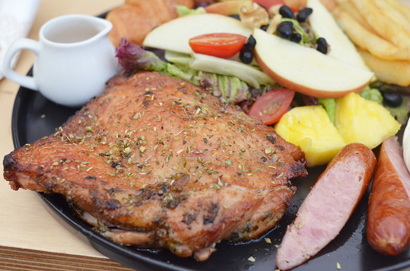 新農豆食堂提供早午餐、定食、飲品和點心的選擇,這日中午到訪,選擇義式烤雞腿早午餐和日式唐揚雞定食,這二者價格一樣,日式唐揚雞定食除了唐揚雞主食外,還有黑豆飯、二道小菜、料很多的味噌湯、茶凍;私心推薦義式烤雞腿早午餐,有一大塊烤的好香又嫩的義式烤雞腿、二塊小可頌、薯條、蔬果黑豆沙拉、香腸和水煮蛋,份量可以吃得很飽,食材吃得到新鮮,味道也好,下回再來還是會點早午餐。