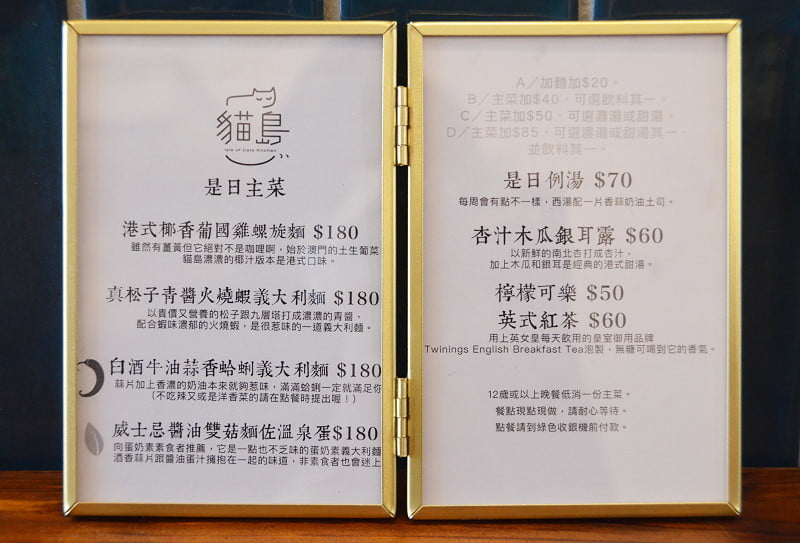 位於台南市北區長北街的貓島廚房,在燒肉難民營隔壁,經由好友芩雯分享,來到貓島吃晚餐,建議事先訂位以免向隅。這是一對香港夫妻所開,相當和善親切,有義大利麵、港點與選物,來這裡一定要點義大利麵,口味獨特,好友也推甜品例湯,但午茶吃太飽,只好下次再點。如果武漢肺炎疫情緩和,真想回到貓島廚房內用呀~