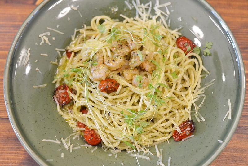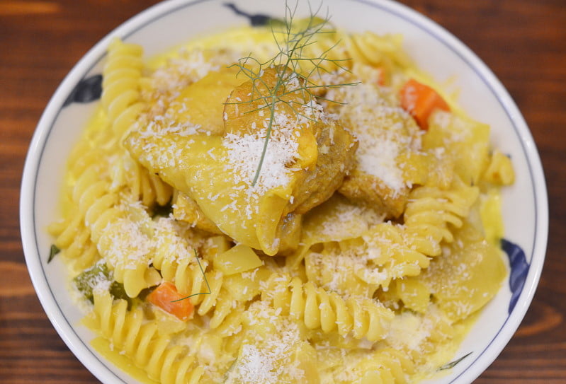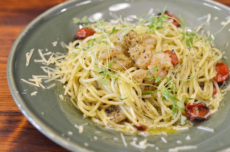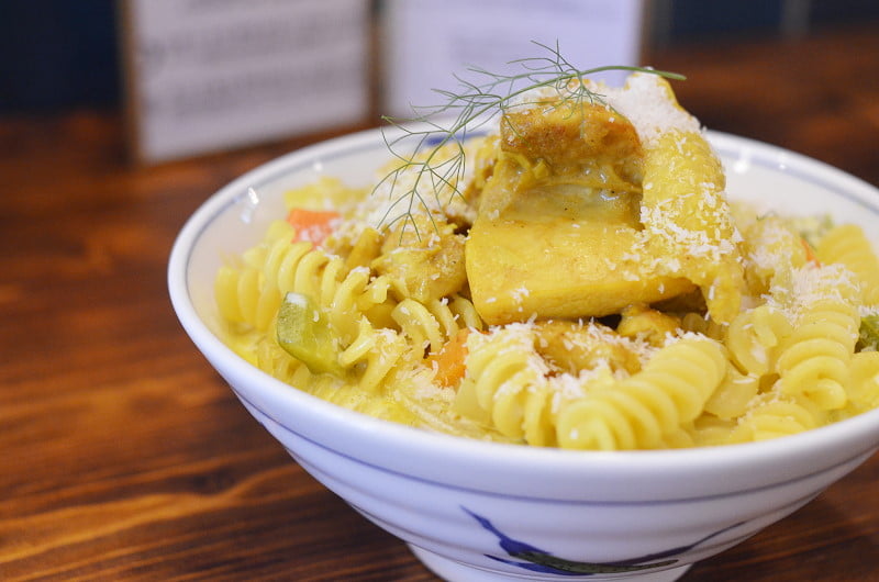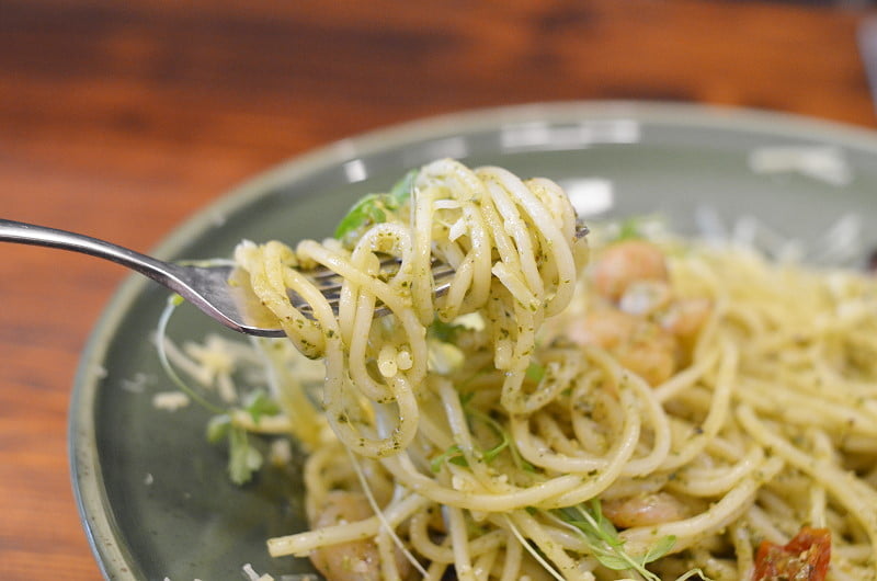 最喜歡的是大面落地窗的景色,把室外的紅磚綠意全納入,偶有鄰人經過,更像一幅愜意景致的畫布,沒坐到桌位也無妨,在吧台還是能看起晴日綠景。這日選的是真松子青醬火燒蝦義大利麵和港式椰香葡國雞螺旋麵,關於火燒蝦,可以閱讀好友撰寫的文章,把火燒蝦的源由演變寫得清楚易讀,看完真的還想再去吃一次火燒蝦義大利麵:)) 青醬搭配鮮香蝦味十足的火燒蝦,很涮嘴的滋味,忍不住一口氣吃完,很後悔沒有一開始加麵,下次來一定要加價加麵才滿足。