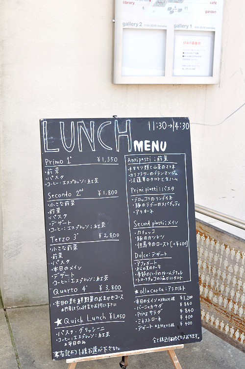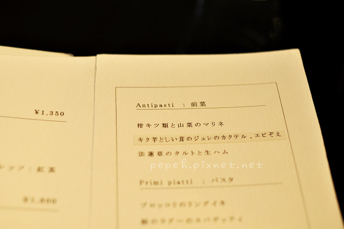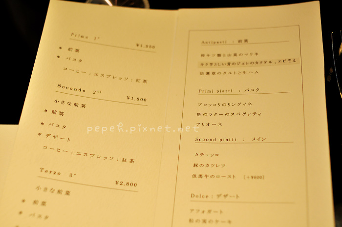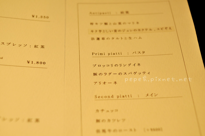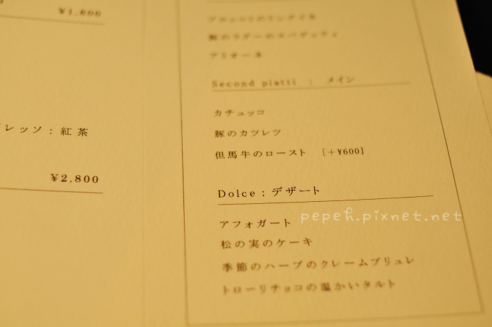 就先介紹第一回去prinz吃的午餐,午餐和其他餐廳一樣,常推出優惠的商業午餐,我們也特別喜歡在午餐時間去撿便宜,那時吃的午餐有三種價格,最便宜是1350円,再來是1800円和2800円,選了中等價位的1800円套餐,這也是服務生推薦的,含前菜、麵包、義大利麵與甜點飲料,再點了一份甜點套餐 840円,年輕親切的女服務員蹲著幫我們點餐,只要看見客人杯子裡的水快空了,馬上拿起手裡的水瓶倒水,殷勤的服務真讓人印象深刻,餐前菜的青醬蒸蛋,外觀與味道都讓人覺得精緻,烤法國麵包配上濃湯也是佳,麵包可以免費再續,就連沙拉都有小驚喜,是蕨菜葉+柑+小章魚的清爽組合,清炒的豬肉義大利麵也很得我們的歡心,豬肉醃的入味,切成碎塊,麵條也煮的好彈性,甜點則選了起士蛋糕,最後以黑咖啡畫下午間套餐的句號。