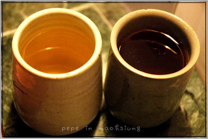 蓋杯茶可選炭焙和普洱兩種,我們兩種都各擇其一,茶湯清香、喝起來沒有苦澀感,喝完了,服務生還會幫忙再倒一杯。