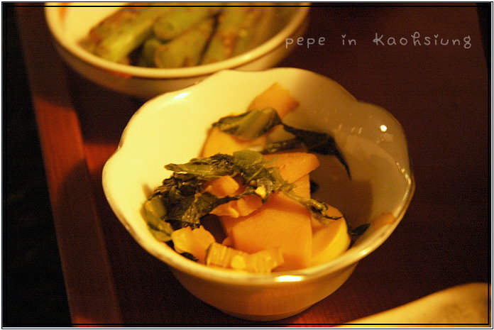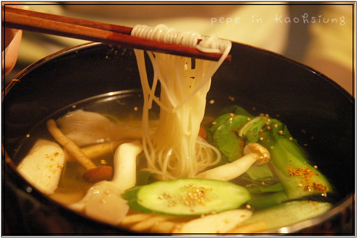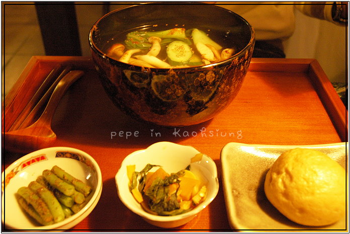 ●一期一會麵線套餐,晚上為200元,內含手工饅頭一份和漬菜二式。以木盤盛裝的菜色和茶屋的佈置很搭,一期一會麵線屬素食風味,裡面放了小黃瓜、青江菜和菇類等料,口味較清淡,麵線的份量不少,剛開始以為吃不飽,後來證明還是可以填飽肚子的。