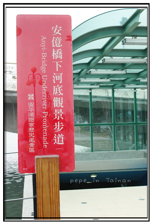 位在運河的安億橋,橋下設了一條河底景觀步道,目的之一是希望能夠讓參觀的民眾看到運河整治的結果,小小一條步道不算長,原本期待看見清澈運河裡有許多魚種和生物悠游其中,市政府也貼了各種魚類介紹,然而,我們只看見水草飄動,有點渾濁的水還是沒能看到魚,也許是那天運氣不好吧..XD
