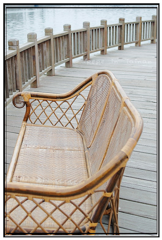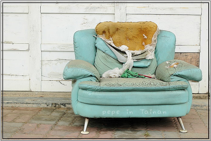 回到停車處,刷白的活動中心門面有著歲月的斑駁,就連破舊的沙發也顥得獨特。