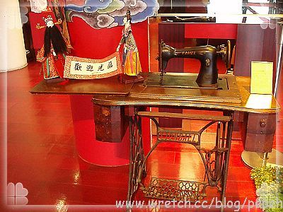 大門一進去就會看到兩個戲偶舉著”歡迎光臨”,還有一台老式裁綘車和放映機歡迎你。