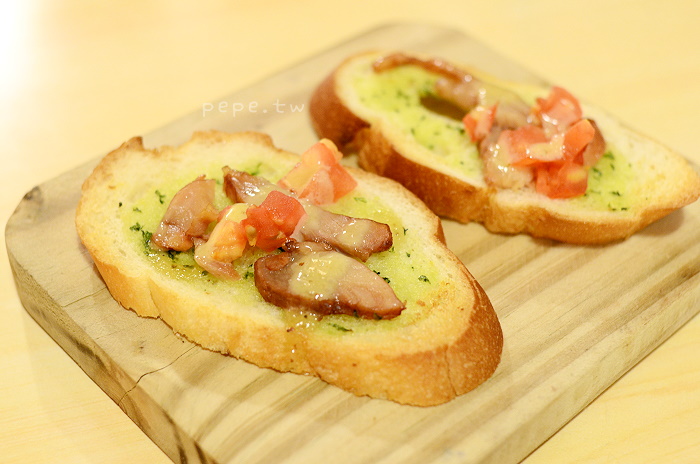 套餐所附麵包,除了抹醬烤熱外,還加了切丁蕃茄與燻雞,放在小木盤上,感覺相當用心。