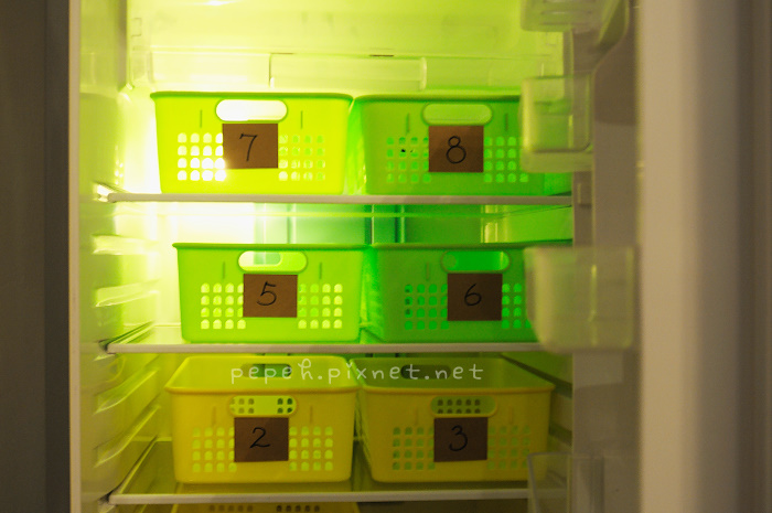 二樓的大冰箱放了各個房間的置物盒,可把自己欲冷藏的食物放在籃中。