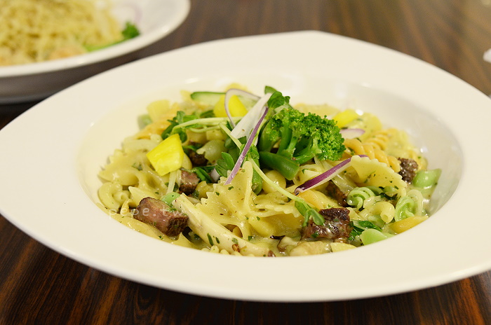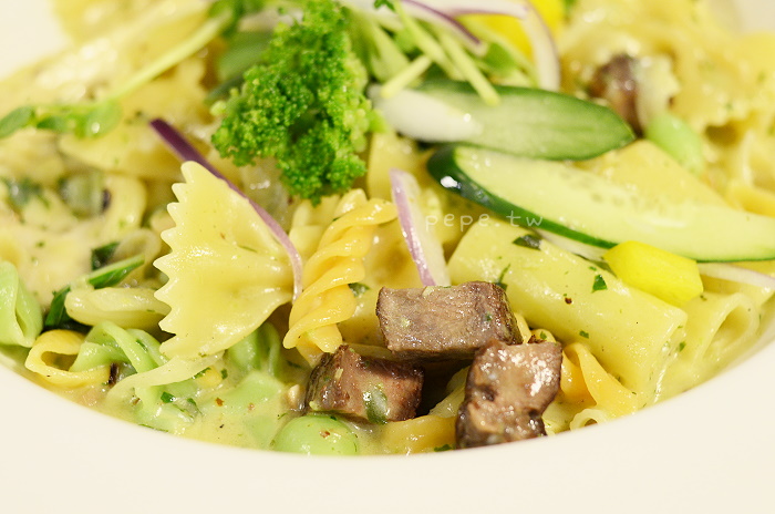香烤嫩煎牛排青醬麵,原為129元,友人加40元變成造型麵,變成169元。