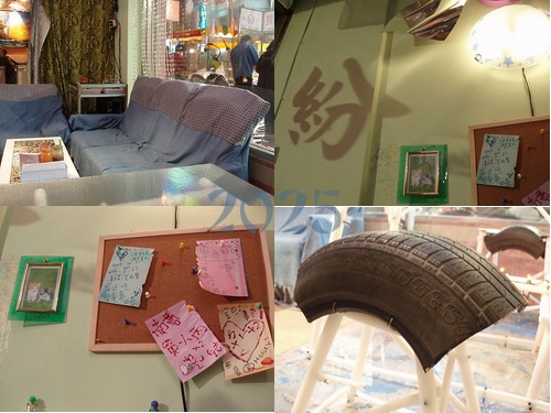 這一張圖,將紛嚮關東煮餐廳的特色分別放入,裡頭有各國或各式STYLE的設計,每個區塊都有獨特的風格,有華麗有隨興,我們坐的是有點海灘風格的區塊,名為”浪”,椅子是輪胎做成的,還是bridgestone的呢!牆面上掛了老闆們的旅遊記事與顧客的心情分享,真是家溫馨的小店!