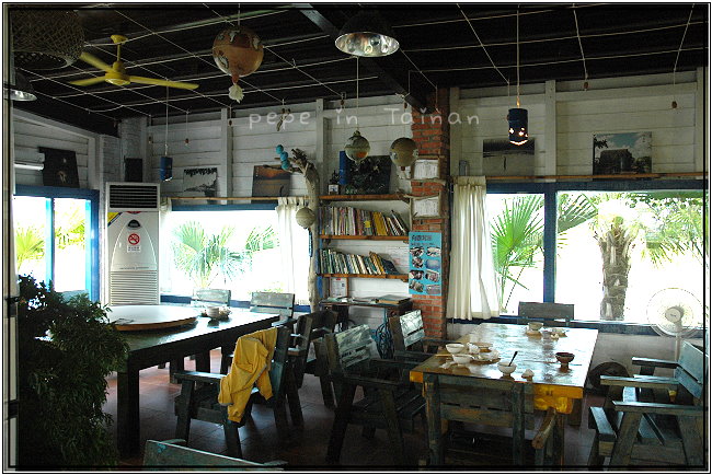 欖人民宿的早餐時間為8:00~9:00,實在很好奇魚家風味早餐的內容為何,走出探更寮,緩步前往藍白建築的餐廳,先推開白色大門,再推開藍色大門,便可看到餐廳內部擺設。