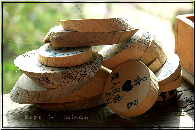 ●窗邊擺放的多個木塊,寫的是滿滿的祝福或心情留言,欖人民宿把它垂掛於美麗的燈具旁。