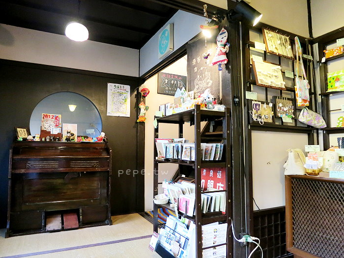 這家咖啡店以水玉雜貨、輕食飲料為主,把町家空間佈置的相當可愛,店員與老闆也相當親切,點了一杯咖啡、水玉可爾必思、起士蛋糕與鹿黑豆芝麻布丁,咖啡是中深焙的滋味,水玉可爾必思需要自己DIY,把小小顆葡萄擠進可爾必思,青綠色的果肉加在淡白色的可爾必思中,彷彿綠色的水玉飲料,好喝又充滿趣味,至於鹿的黑豆布丁,因為鹿的造型餅乾而大大加分,加了m&m巧克力的起士蛋糕也非常好吃,那天剛好脖子圍了一條水玉圍巾,老闆說因為水玉配件會有招待哦!招待了餅乾與可爾必思果凍,還有折扣的小優惠這裡的雜貨好看又好買,離開前買了二張奈良初心者地圖與咖啡信箋,做為旅行紀念與送好友的伴手禮~^^