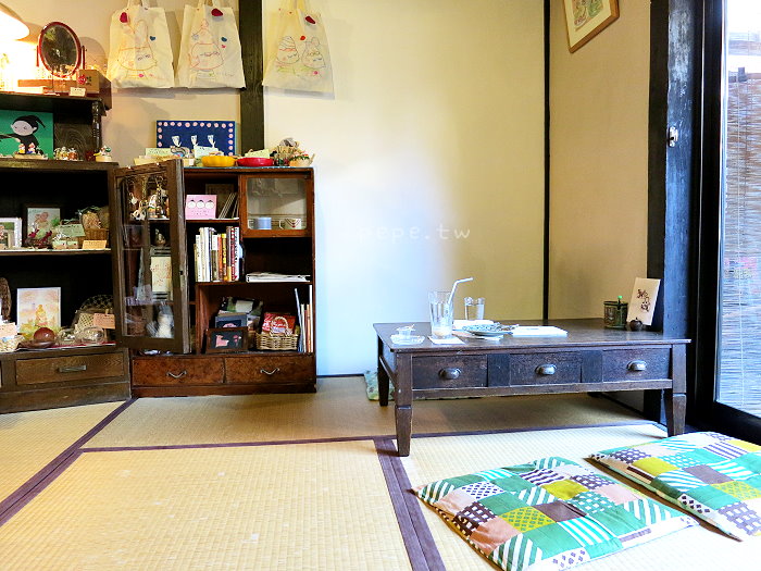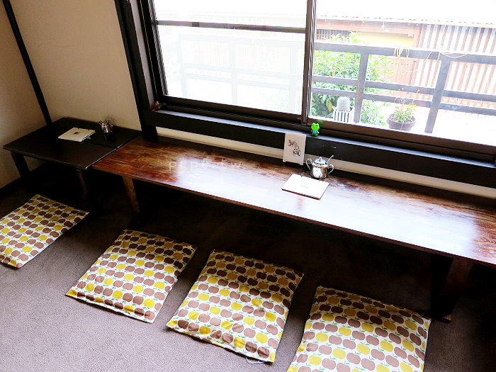 町家外觀,加上有創意的站牌設計,光是建築立面就讓駐足許久才甘願進去,窗邊的位置只有二張,還有一張空桌,幸運的坐到窗邊座位,二樓的視野與風景其實也很棒,如果沒坐到窗邊的位置,我們應該會考慮坐二樓的座位區,那天二樓剛好有個展覽,店員親切的提醒我們展覽只到今天18:00結束,咖啡店20:00才休息,建議我們可以先去看展覽再慢慢喝咖啡,因是最後一天,佈置的主人-Tanami小姐也來到現場,很佩服她手作的小物巧思,可惜語言不太通,無法多聊聊..~><