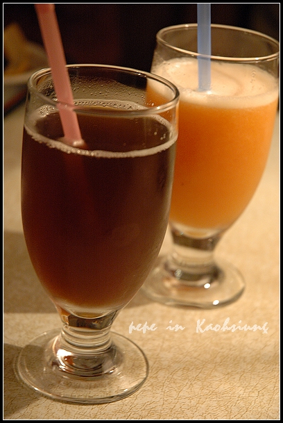 ●飲料,前方那杯是微酸的烏梅汁,後方則是新鮮現榨果汁,是用西瓜、鳳梨等水果打製而成的。