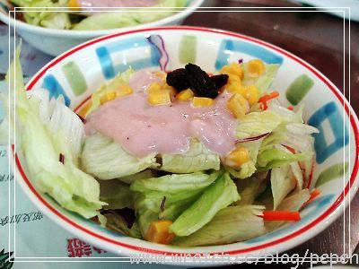 這是套餐附的沙拉,是我喜歡的沙拉醬,因為它是用類似蔓越莓的莓類醬汁,配上萵苣、玉米粒、葡萄乾等菜,好吃好吃..^^