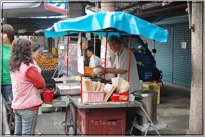 星期六早上8點多,鹽水的炭火雞蛋糕還沒推出小攤子,先去吃市集裡的蛋餅,