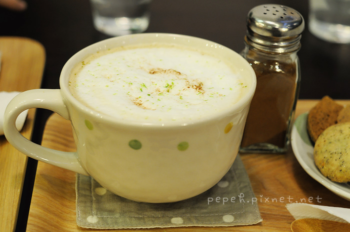 點了一份附卡布其諾的餅乾套餐,與一杯抹茶歐蕾,擺盤的模樣好讓人喜歡,忍不住多拍了幾張,幫我們點餐的”店員”因為點餐的不熟悉,”店員”才笑說她是一樓ca va的老闆娘,上來做客兼幫忙,讓我們也忍不住笑說其實本來是想先去ca va坐坐的,一、二樓各有一間雜貨咖啡,十分友好,但因為這一整天吃吃喝喝,無法一口氣容納二家雜貨咖啡,只有進去參觀ca va,真是可惜。
