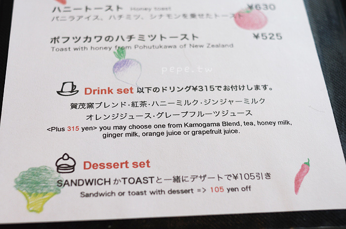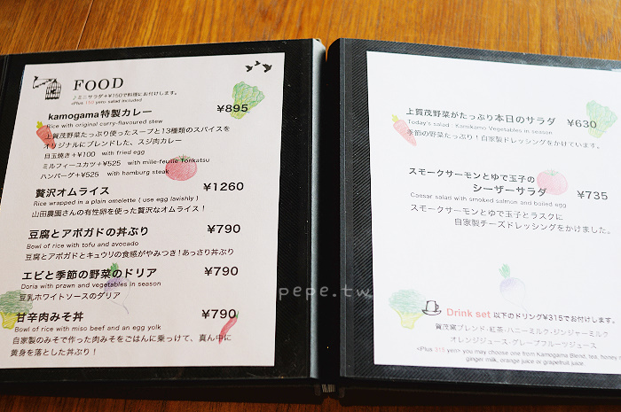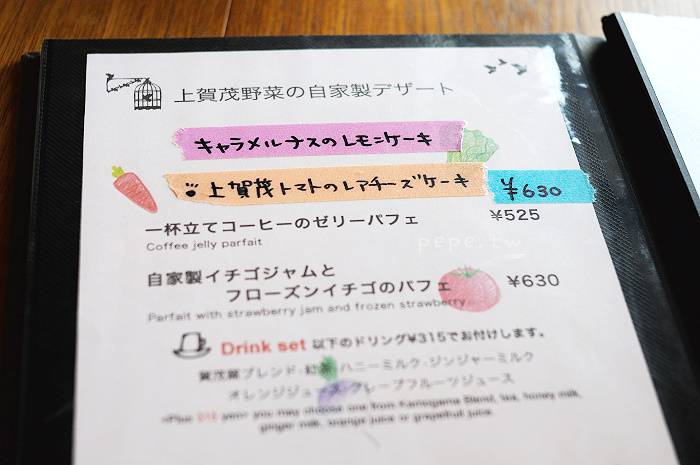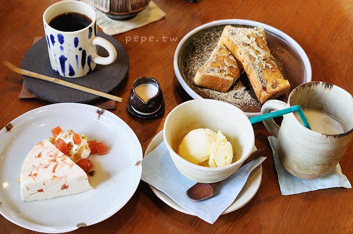 這間咖啡館的一樓是陶藝教室、二樓是咖啡館,要去二樓前得先脫掉鞋子、換上舒服的軟拖鞋上樓,打開菜單,很多餐點都是以蔬果為主,把在地蔬果做成各式美味的餐點,連不愛蔬果的友人也盛讚其味道,點輕食再加315円就可多一杯飲料,相當划算,於是我們各點了一份飲料套餐做為午茶內容,無論是黑蜜烤吐司+黑咖啡,或是蕃茄起士蛋糕+蜂蜜牛奶,甚至連加點的香草冰淇淋也都相當好吃,兼顧健康與美味,每種餐食盛裝的陶製食器都是自製,擺盤自然好看,來到上賀茂神社及其手作市集時,很推薦來這家咖啡館坐坐,欣賞陶作與美味餐食。