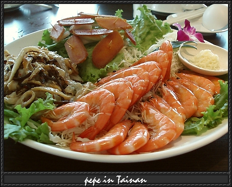 碳烤烏魚子+安平港清蒸紅蝦,對於紅蝦的鮮美一直很難忘,我埋頭吃了好幾隻,清蒸更顯出蝦子的肥美。